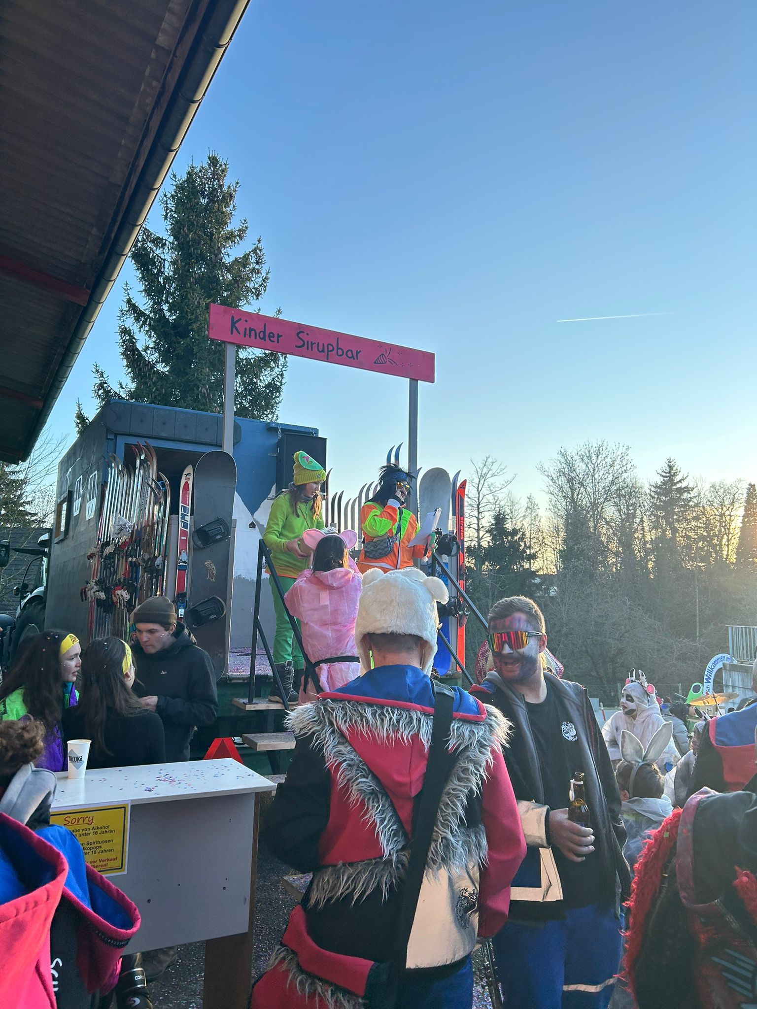 Mit lautem Gehupe fiel um 15.03 Uhr der Startschuss. Der Jubla Wagen rollte als erster über die Hauptstrasse und trug die Aufschrift: «Auffe aufn Berg und obe mit de Ski». Es war ein echter Partywagen mit stimmungsvoller Musik, Lichteffekten und einer Sirup-Bar für die Kinder.