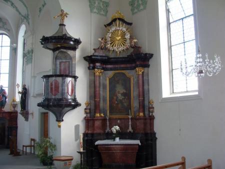 Erbaut wurde die heutige Kirche in den Jahren 1753 / 1754. Die alte Kirche wurde 1753 abgerissen, weil das kleine und baufällige Gotteshaus nicht mehr genügte. Im Jahr 1784 brannten ein Teil des Dorfes und die Kirche nieder. Die Kirche wurde schwer beschädigt, musste aber nicht vollständig wieder aufgebaut werden. Die letzte Restaurierung fand in den Jahren 1977 bis 1979 und 1998 bis 2000 statt.