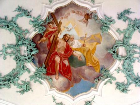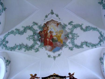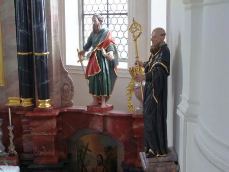 Die Barock-Kirche St. Peter und Paul ist von weit her sichtbar. Der einfache Kirchenbau ist umgeben von einer rechteckigen Mauer, die auch den Friedhof und den Aufbahrungsraum umgibt. Vor dem heutigen Aufbahrungsraum, der einst als Waschhaus diente, stehen zwei Glocken aus den Jahren 1786 und 1859.